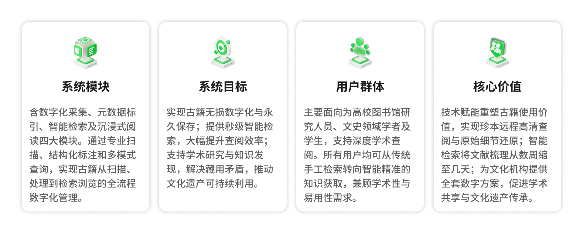 “古籍数字化检索平台”是为高校图书馆开发的古籍文献数字化管理平台,通过先进技术将珍贵纸质文献转化为可检索的数字资源,实现对文化遗产的永久保存和高效利用。